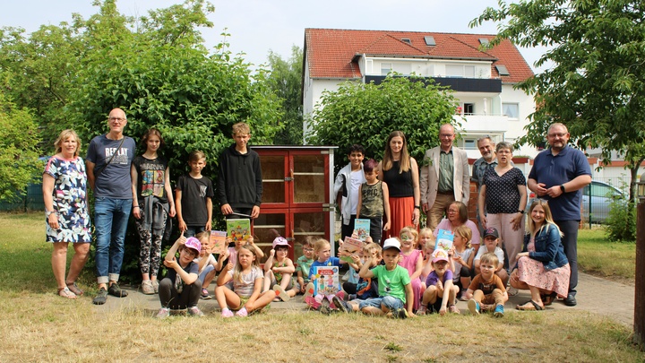 Die Kindertagesstätte Astrid-Lindgren in Schöningen hat einen neuen Bücherschrank erhalten. Entworfen und gebaut wurde der Schrank von der Praxisklasse der Eichendorffschule. Die entstandenen Kosten dafür wurden von dem Verein „Guter Zweck e.V.“ aus Schöningen übernommen. Aufgestellt wurde der Bücherschrank auf dem Gelände der Kindertagesstätte. Darin werden in Zukunft Bücher untergebracht, die sich die Kinder selbständig herausnehmen oder auch eigene dazustellen können. Zur Übergabe anwesend waren die Teamleiterin der Kindertagesstätte Diana Hein, Schulleiterin Gabriela Ruhe von der Eichendorffschule, die leitenden Lehrer der Praxisklasse Jörg Beyer und Matthias Klage und die Schülerinnen und Schüler, die das Projekt verwirklicht haben. Vom Verein „Guter Zweck e.V.“ waren Petra und Gisbert Krake und Jan Fricke vor Ort. Außerdem waren seitens des Trägers der Städtische Direktor Karsten Bock sowie einige Kinder aus der Kindertagesstätte mit ihren Erzieherinnen vor Ort, um den neuen Bücherschrank sogleich in Augenschein zu nehmen.
