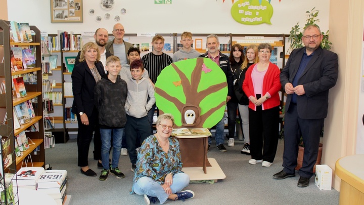 Am Montag, den 15. Mai 2023, ist die Vorleseeule „Luka“ offiziell in die Stadtbücherei Schöningen eingezogen – mitsamt ihrem eigens geschaffenen Baum.