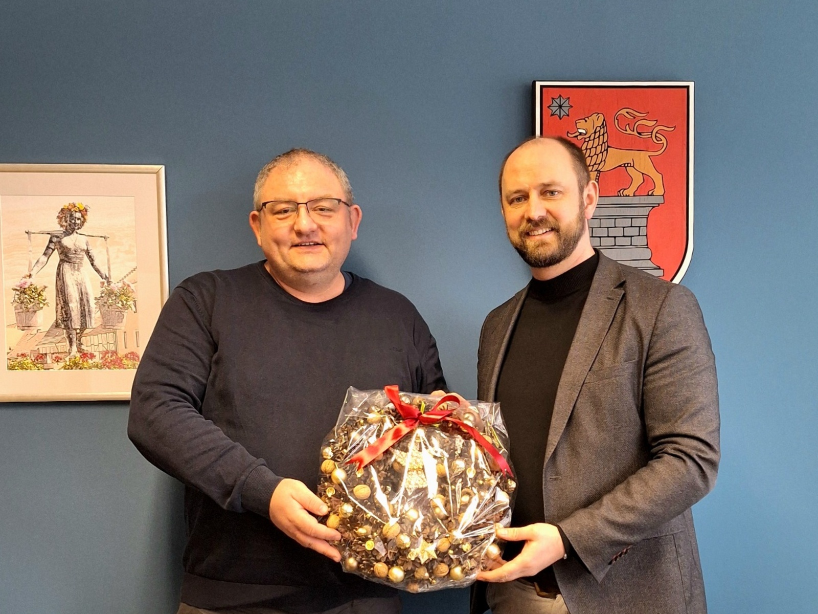 Bereits seit 1997 sorgt der eigens gegründete Partnerschaftsverein Solotschiw-Schöningen e.V. für eine lebendige Freundschaft. Seit Kriegsbeginn unternehmen die Mitglieder regelmäßige Fahrten, um Hilfsgüter nach Solotschiw zu transportieren. Von der letzten Fahrt Ende 2025 brachte Vereinsmitglied Jan Fricke (li.) in Form eines Friedenskranzes Grüße und Dank mit nach Schöningen. Er überreichte ihn nun im Schöninger Rathaus an Bürgermeister Malte Schneider: „Kein Tag vergeht, an dem unsere Gedanken nicht bei den Menschen in der Ukraine und in Solotschiw sind. Nichts wünschen wir unseren Freundinnen und Freunden mehr, als endlich Frieden.“