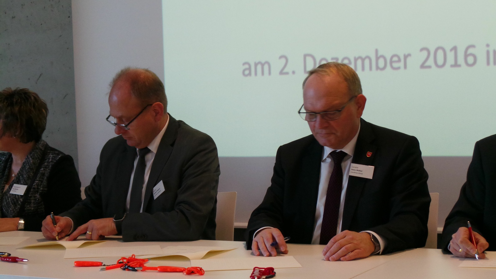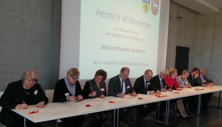 Am Freitag, 2. Dezember, trafen sich die Landräte des Bördekreises und des Landkreises Helmstedt Hans Walker und Gerhard Radeck sowie die Vorsitzenden der LEADER-Arbeits-Gemeinschaften (LAG) Flechtinger Höhenzuges, Colbitz-Letzlinger-Heide, Börde und Bördelandes, Rund um den Drömling sowie Grünes Band im Landkreis Helmstedt und der ILE-Region Elm-Schunter im paläon in Schöningen, um die Kooperationsvereinbarung zum gemeinsamen Ausbau der Wirtschaftssäule Tourismus zu unterzeichnen.