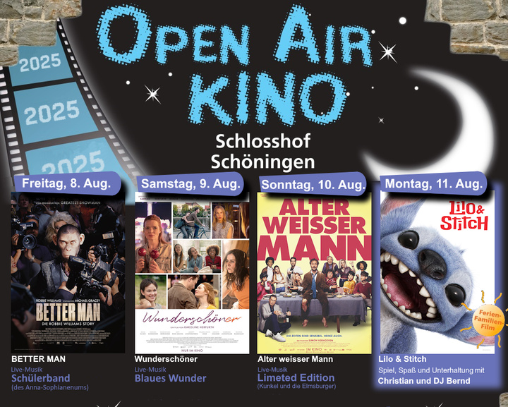 Zum 21. Mal laden die Helmstedter Kinos in Zusammenarbeit mit der Arbeitsgemeinschaft „Schönywood“ zum Open Air Kino in den Schlosshof – zum zweiten Mal nicht zu Beginn, sondern zum Ende der Sommerferien. Vom 08.-11.08.2025 findet das besondere Kinoerlebnis unter freiem Himmel in diesem Jahr statt.