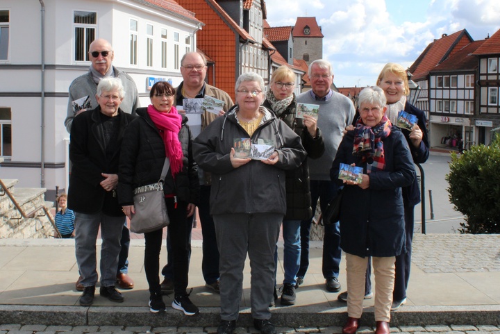 Schnell war die Idee geboren, den Vereinsgeburtstag mit dem Stadtjubiläum zu verbinden und eine Postkartenedition herauszubringen. Entstanden sind zehn Motive, teils eigene Aufnahmen des Mitglieds Wolfgang Mertens oder historische Ansichten aus der Sammlung von Heinz-Uwe Marquardt.