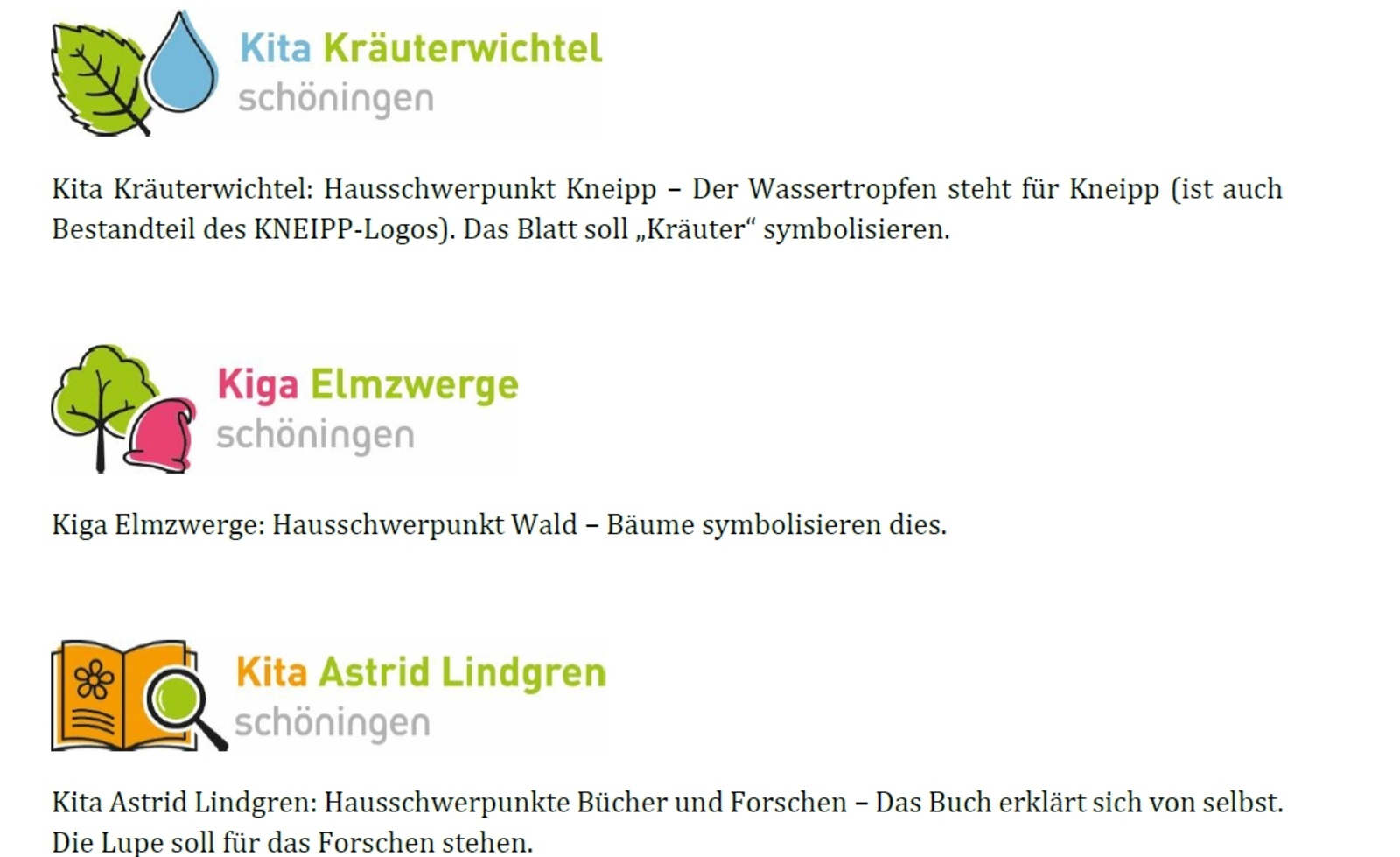 „Die Logos zeigen die Hausschwerpunkte der jeweiligen Kindertageseinrichtung. Das einheitliche Design symbolisiert, dass wir zusammengehören. Außerdem zeigen wir deutlich, dass wir Einrichtungen der Stadt Schöningen sind“, fasst Diana Hein zusammen.